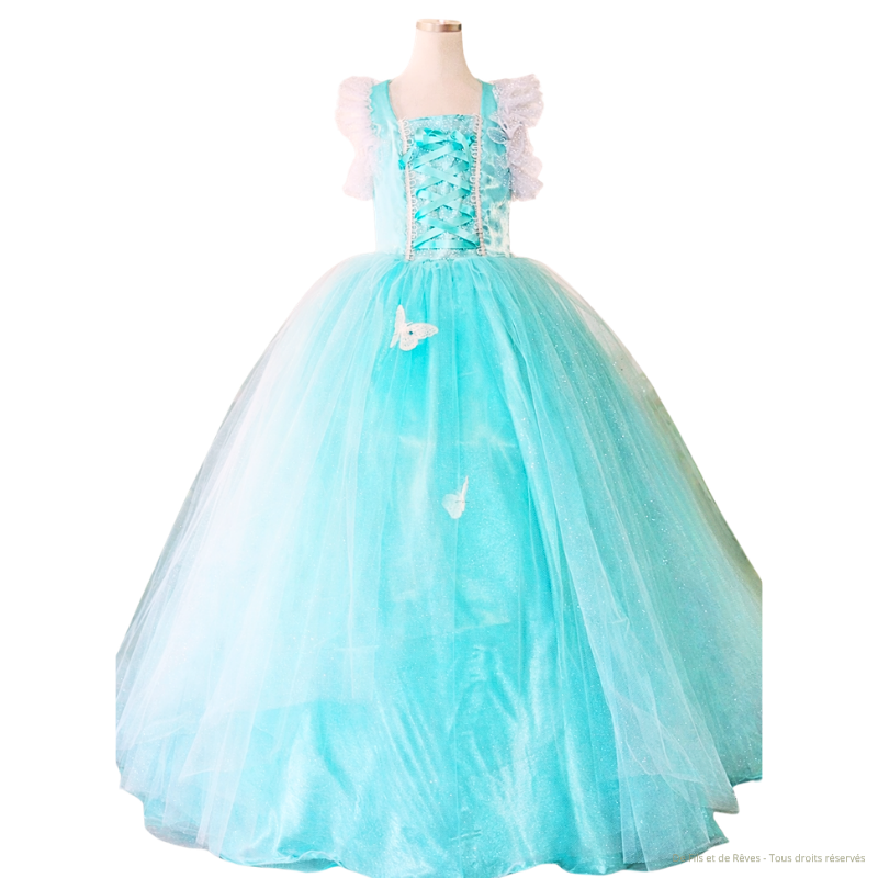 La robe de Princesse Aurelyne est confectionnée en satin polyester. La jupe est réalisée avec une couche de satin, une couche de tulle classique et une couche de tulle pailletée. Son bustier est doublé avec des petites manches volantes en tulles plumetis. Fermée avec une fermeture éclair au dos. Dispose d'une ceinture de tulle pour nouer la taille de la robe. Taille 8 ans. Vendue sans jupon.