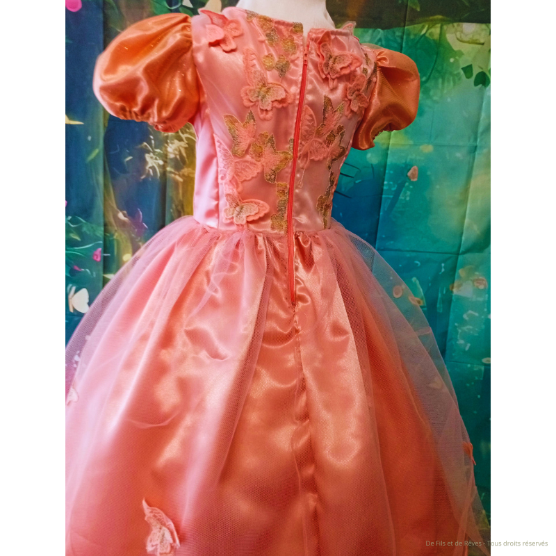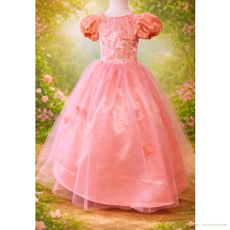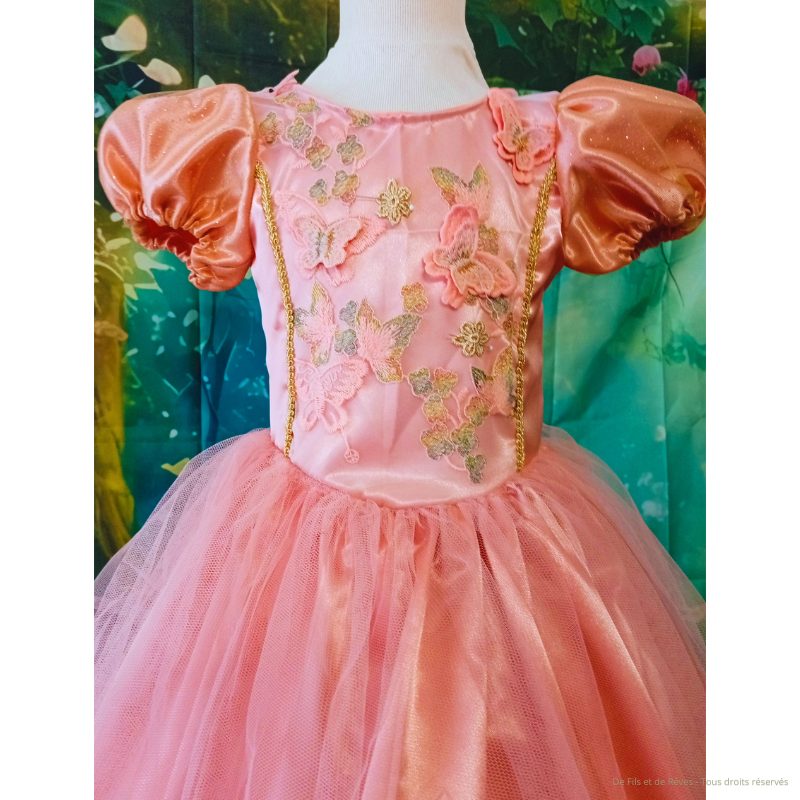Adoptez cette jolie robe de princesse Cyrianne pour fille taille 6 ans. Une robe délicatement satinée rose poudrée, sublimée par de fines broderies florales et quelques papillons. Sa jupe en tulle vaporeuse apporte volume et poésie parfaite pour transformer chaque instant en conte de fées. Confectionnée en satin polyester, tulle, tulle brodé en papillon en relief sur le bustier. Ses manches sont doublées d'un tulle doré.