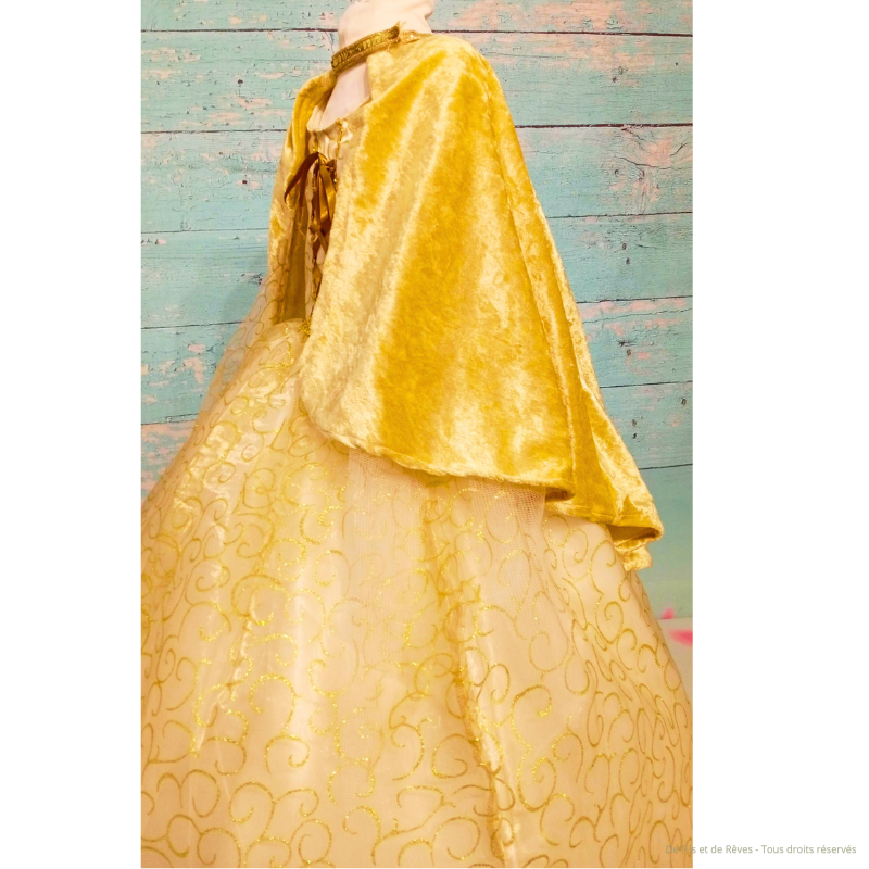 Son bustier raffiné avec laçage décoratif apporte une touche de charme, tandis que sa jupe volumineuse en tulle et organza pailleté offre un effet princesse spectaculaire. Les manches courtes assurent un bon confort, et la petite cape en panne de velours vient compléter ce look royal avec délicatesse.