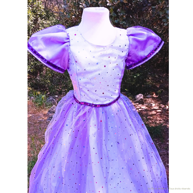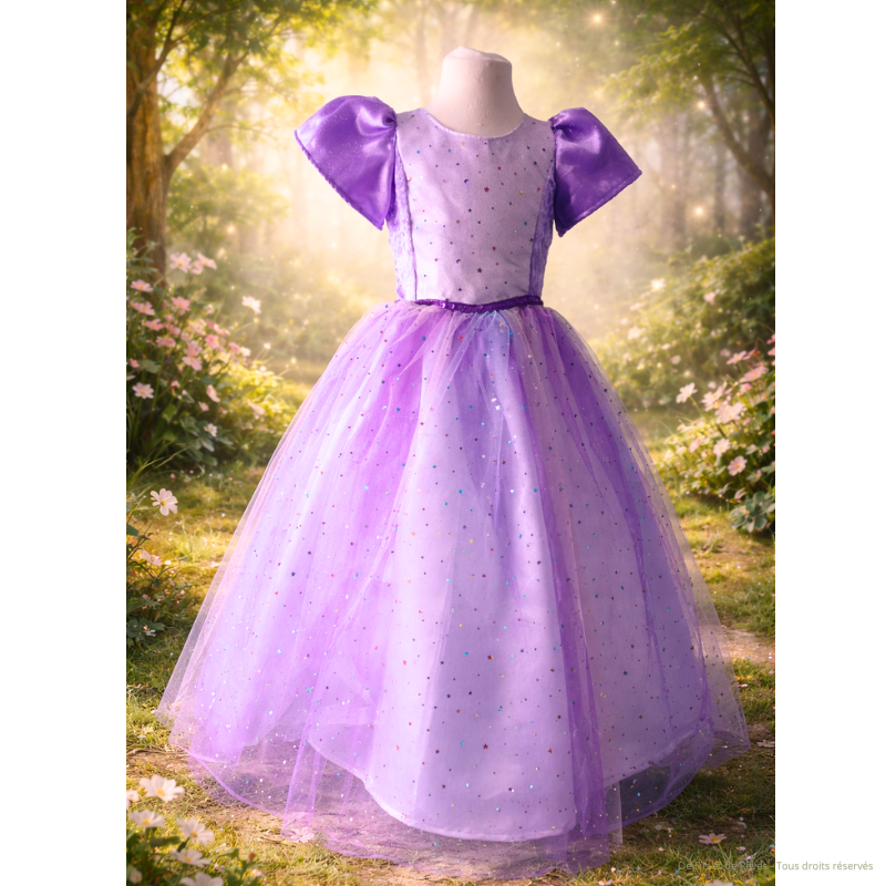 Cette robe de Princesse Anaëlle pour petite fille de 5-6 ans couleur parme, scintillante par son corsage délicat parsemé d'étoiles brillantes apporte une touche magique. Sa jupe en tulle dégradé subtilement pailleté d'étoiles offre un volume féérique parfait pour jouer à la Princesse.