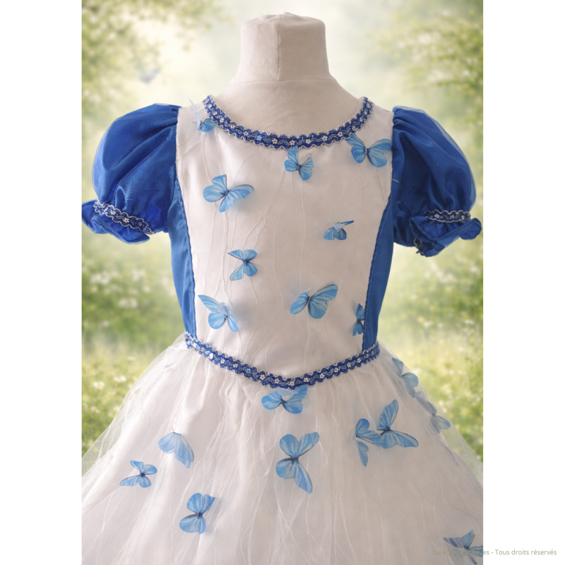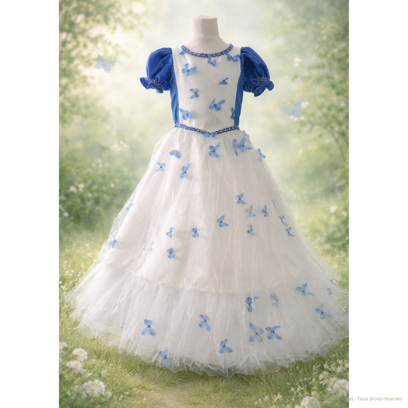 Cette robe de Princesse Azélie de taille 6-8 ans pour fille nous plonge dans un univers féérique. Une création délicate ou chaque détail évoque la légèreté et la poésie. Son bustier subtilement orné de papillons bleus semble prendre vie. Ses manches bleu marine en satin apportent une tenue élégante et les gallons cousus viennent sublimer l'ensemble. Une robe à la fois simple et raffiné le bustier taille un peu plus grand qu'un 6 ans.