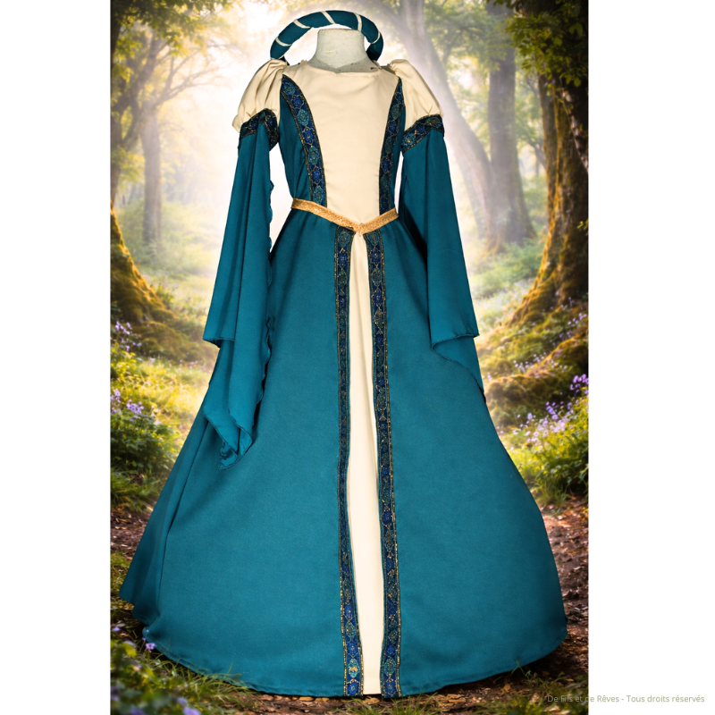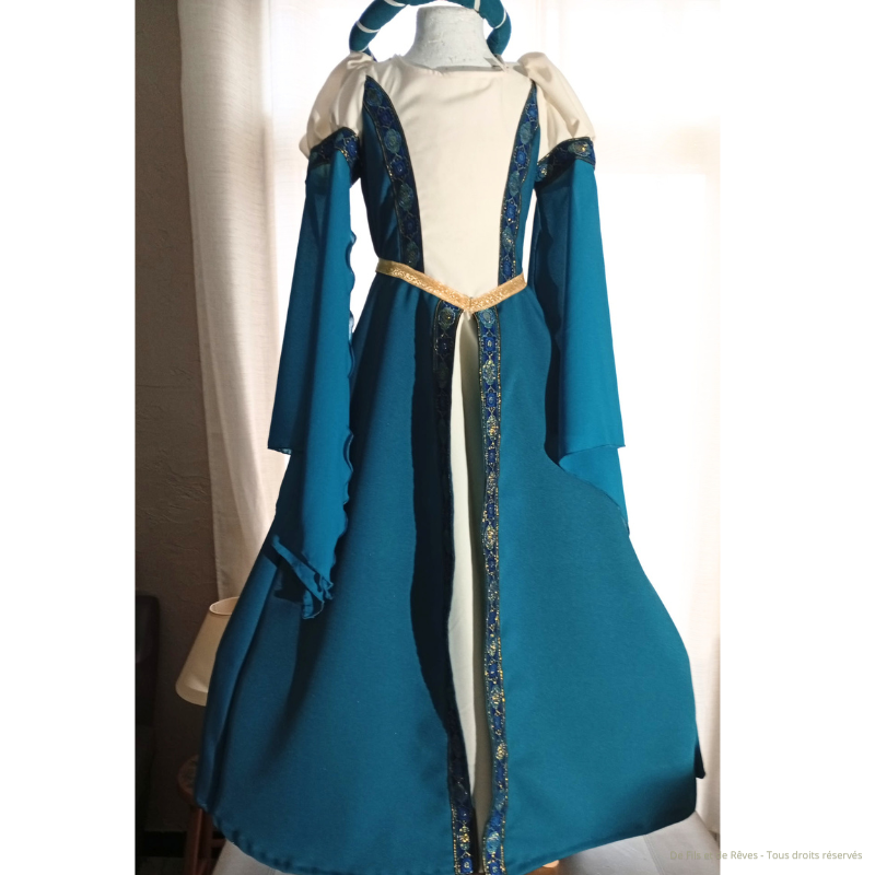 Robe de princesse Elfique Elwen de taille 8 - 10 ans pour fille, aux nuances bleu pétrole et écru inspirée des forêts enchantées. Elégante, elle incarne la magie et la douceur des bois confectionnée en tissu Burlington et mousseline sublimé par un joli galon. Cette robe sera idéale pour un mariage ou autre événement. Vendue avec sa couronne.