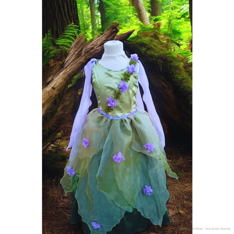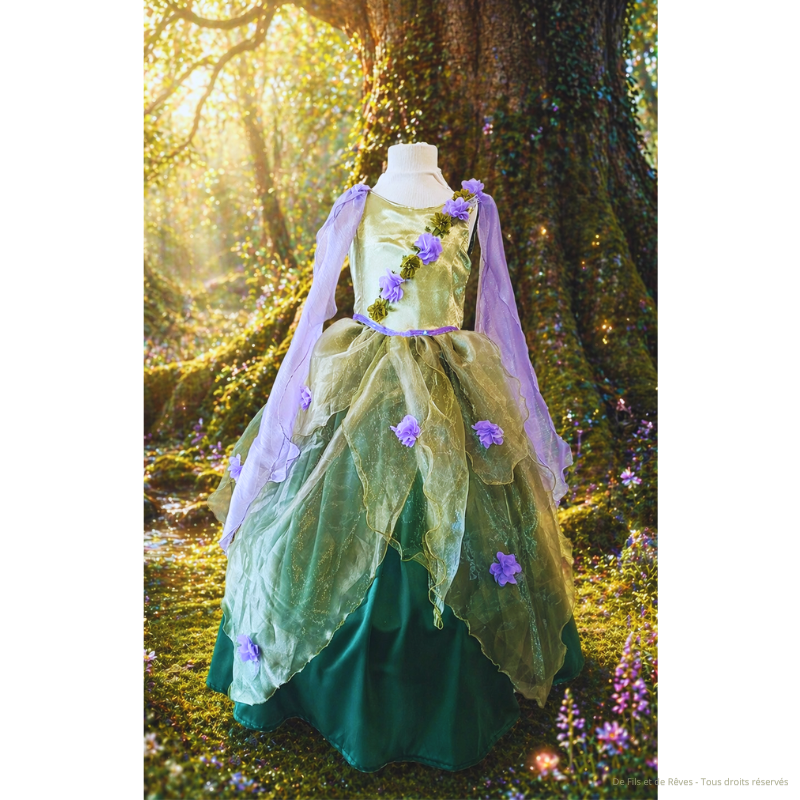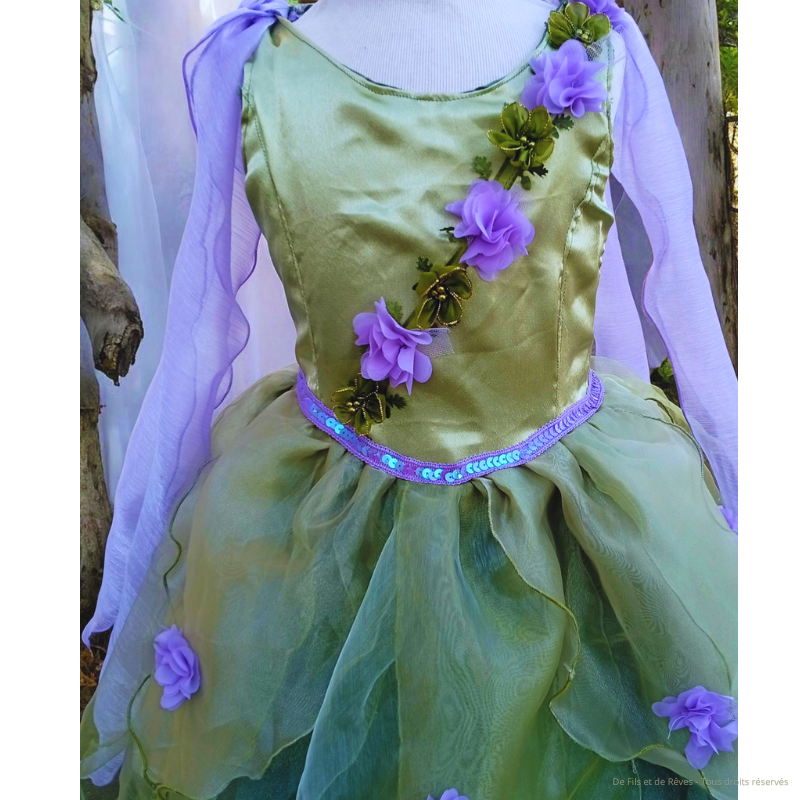 Cette magnifique robe de princesse Idrile verte pour petite fille de 6 ans, évoque l'élégance elfique entre nature et féérie. Son bustier délicatement orné de fleurs vertes et mauves créant un travail raffinée et poétique. Sa jupe s'ouvre sur des pointes en organza parsemée de fleurs mauves cousues main pour un effet enchanté.