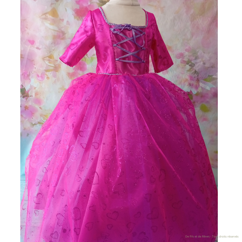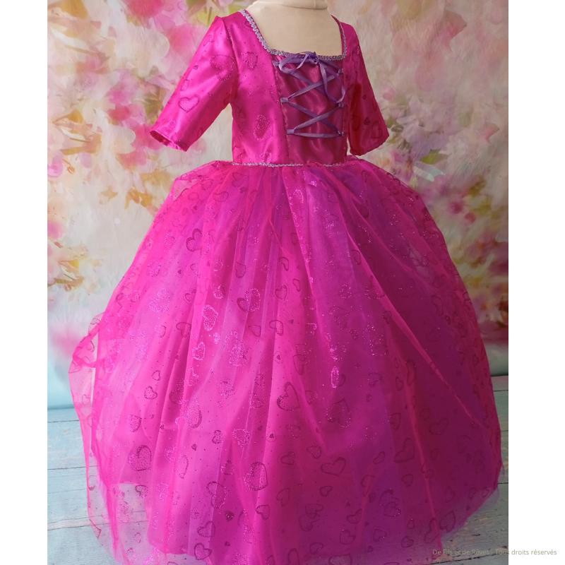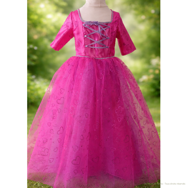 Cette robe de princesse Lovely fuchsia pour petite fille de 3 ans, allie un bustier en satin délicatement structuré avec un laçage élégant et une jupe en tulle et organza pailleté ornée de petits cœurs qui lui donne une allure tendre et lumineuse. Ses manches mi-longues aux finitions raffinées apportent une touche de grâce pour une tenue de princesse moderne.