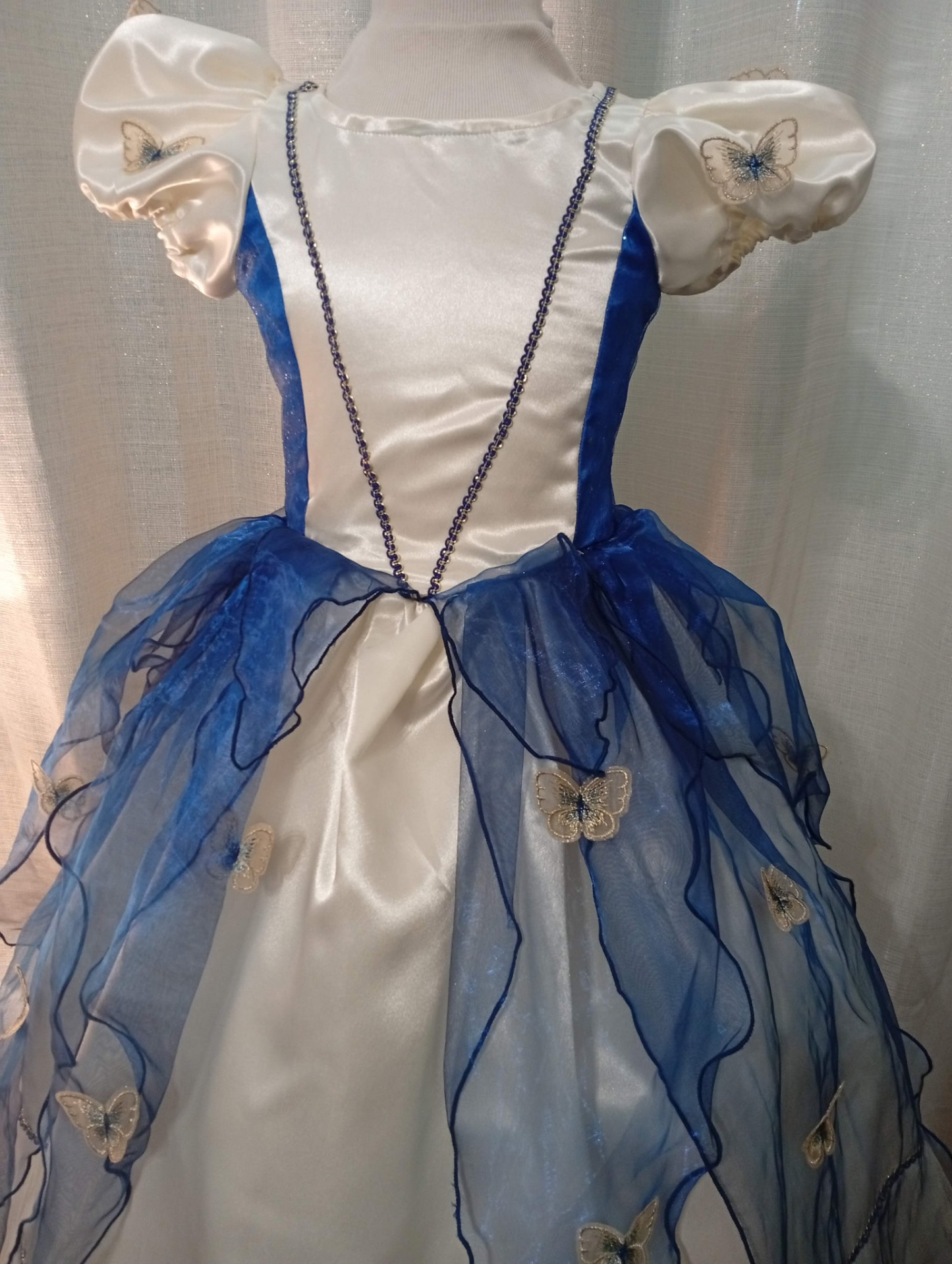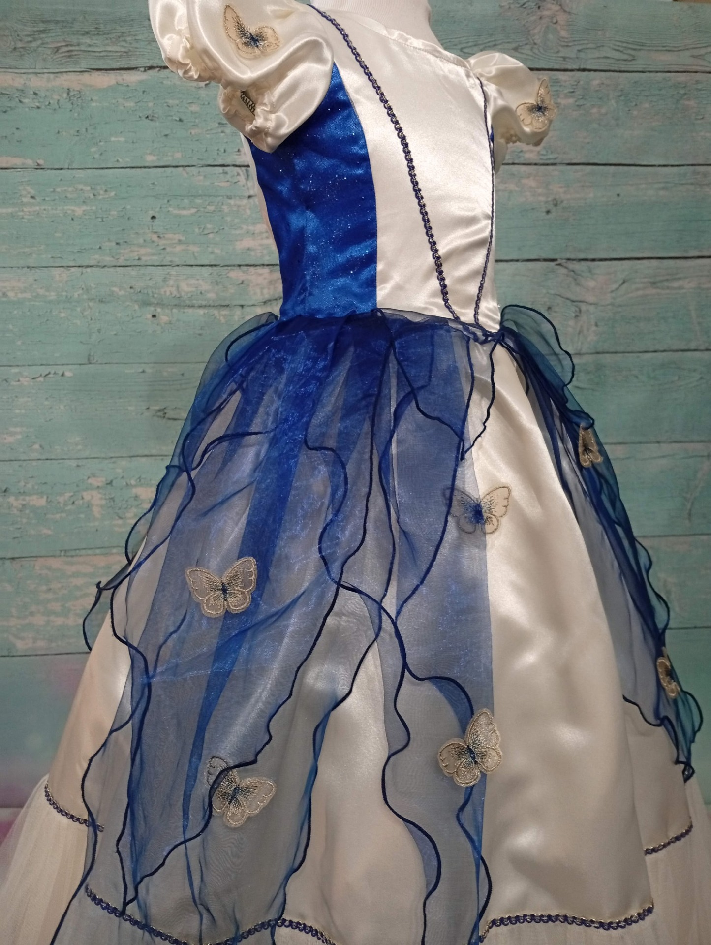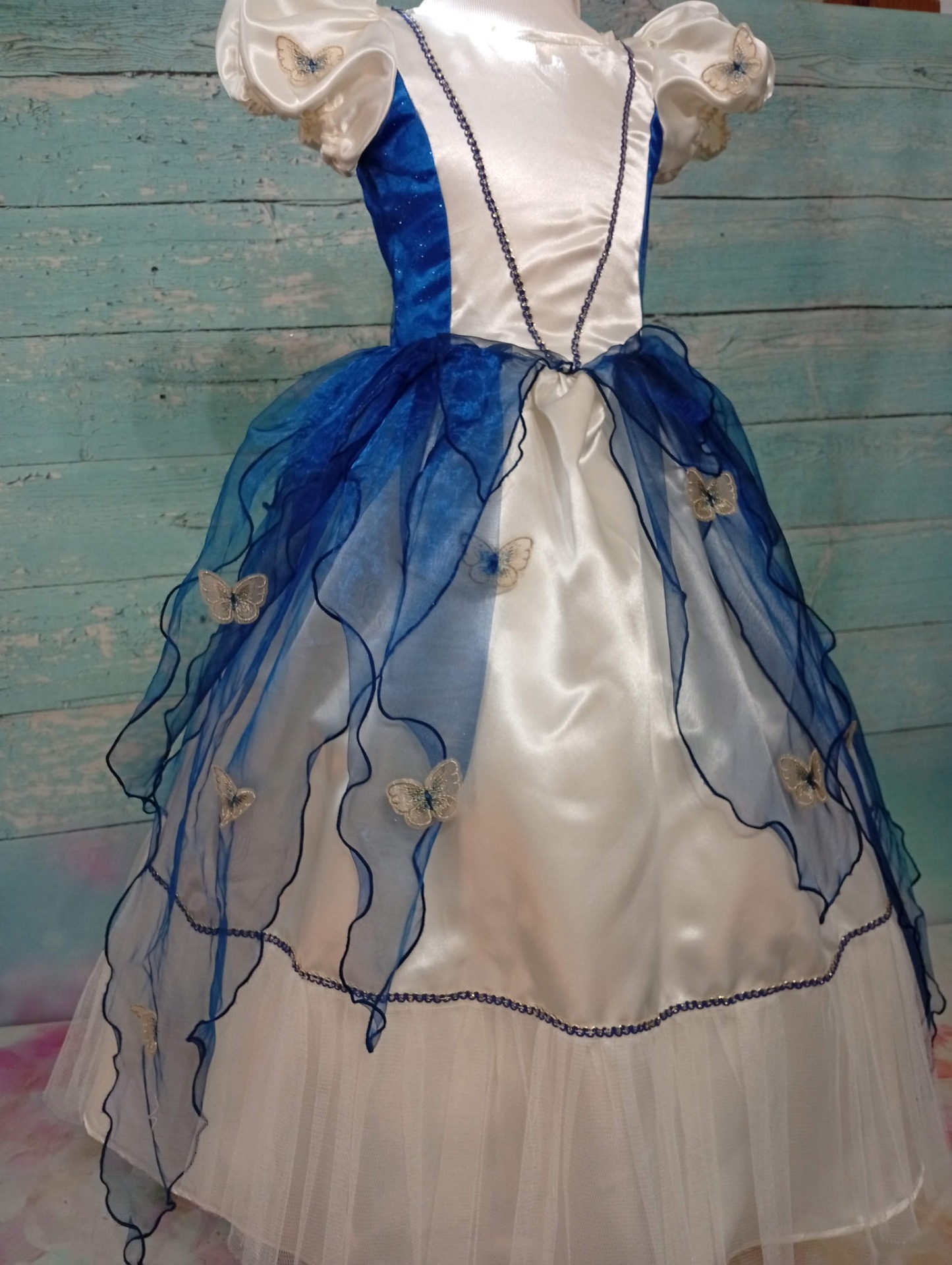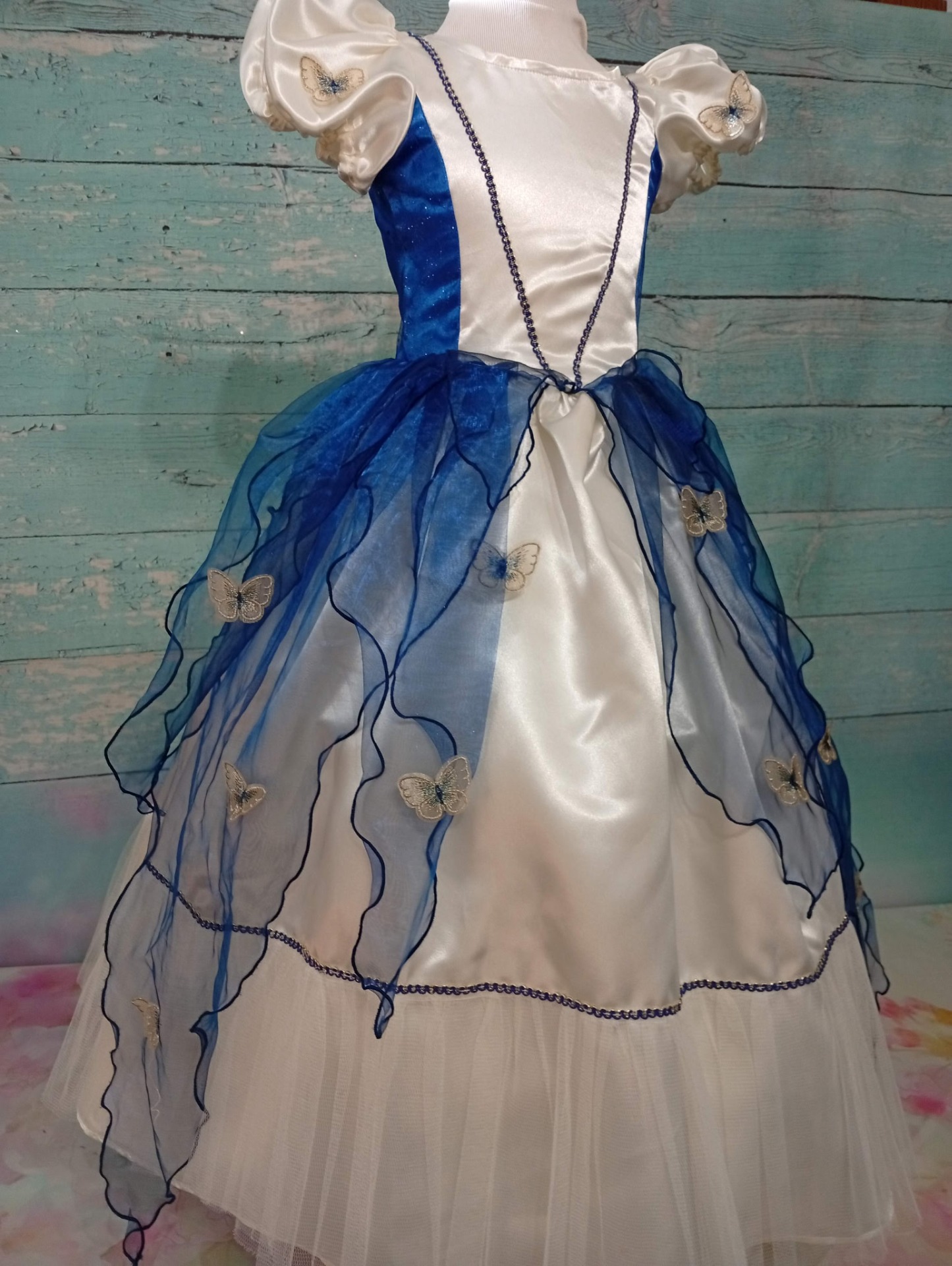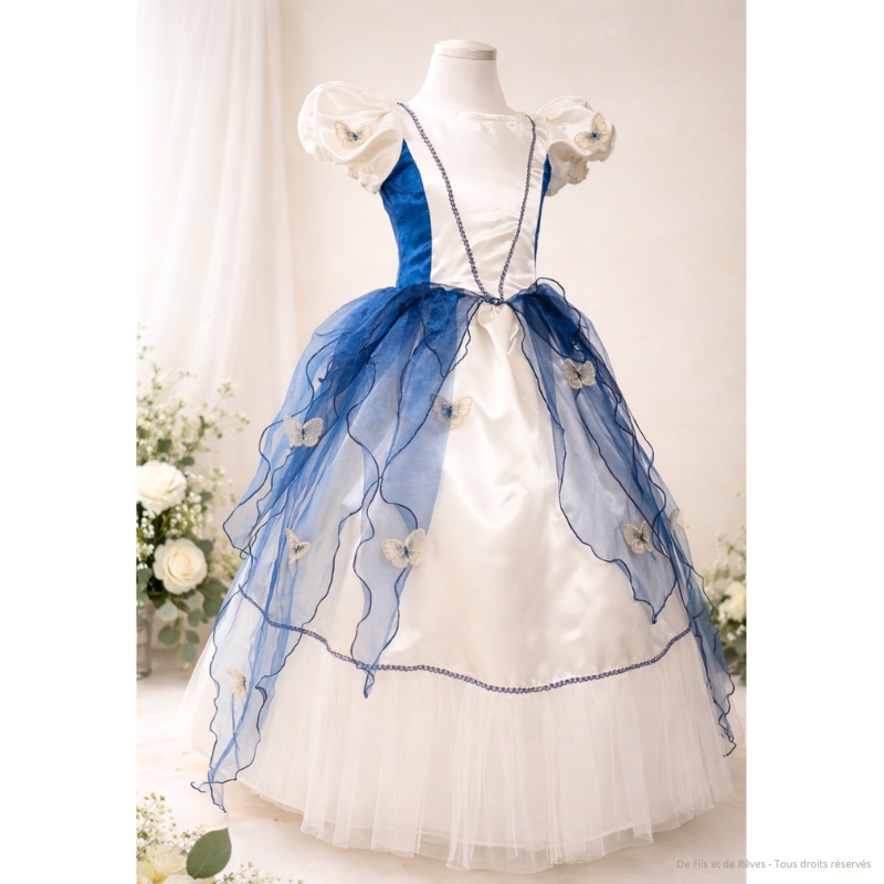 Cette splendide robe de princesse Mélusine pour petite fille de 5 ans sera la robe idéale pour des événements comme une cérémonie ou un anniversaire. Confectionnée en satin polyester, sublimée par de délicate d'organza bleu nuit apporte une légèreté et mouvement. Création unique, élégante et aérienne parfait pour illuminer les moments les plus précieux de la vie de votre petite fille avec douceur.