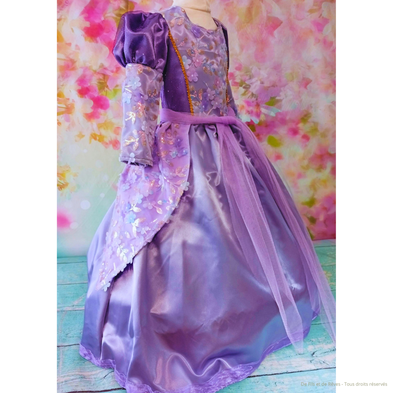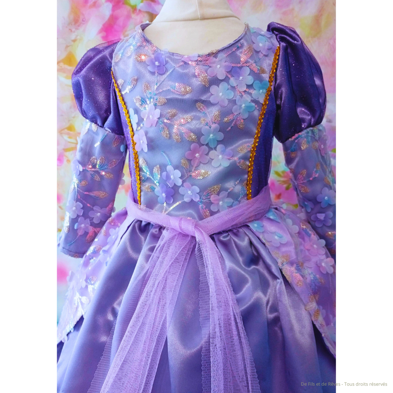Magnifique Robe Princesse Naelys pour petite fille de 5-6 ans de fabrication artisanale en satin de couleurs parme, sublimée par un tulle fantaisie floral. Son bustier est doublé à l'intérieur en satin et extérieur avec un tulle pailleté doré.