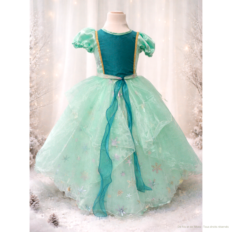 Robe de princesse Ophéa de taille 4 ans fillette. Robe féérique aux nuances vert d'eau et bleu pétrole. Sa forme originale apporte du volume. Ses manches bouffantes et ses finitions dorées lui apporte une touche précieuse idéale pour une allure de princesse, une vraie élégance.