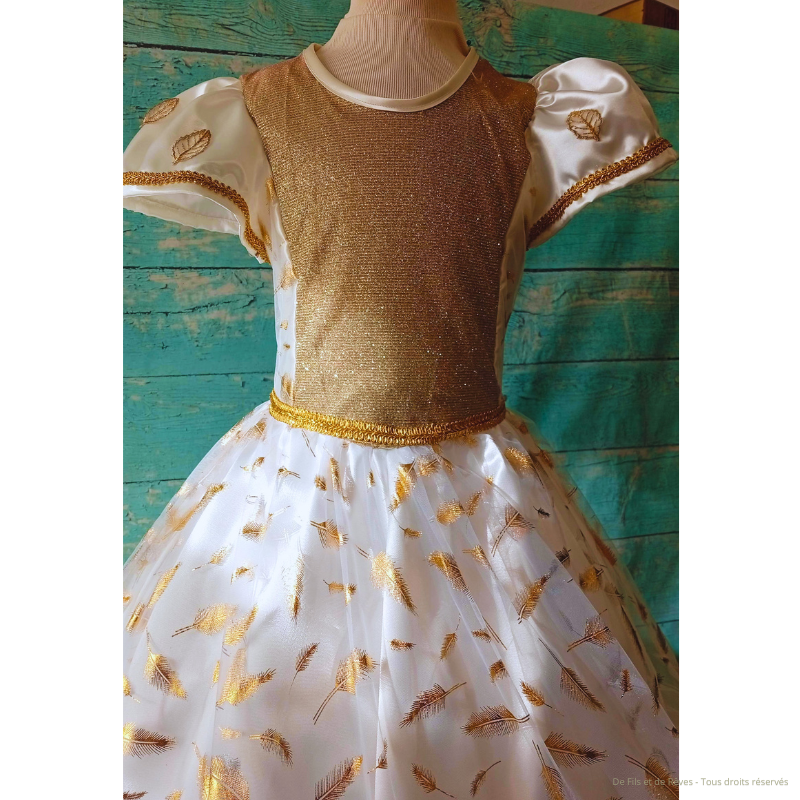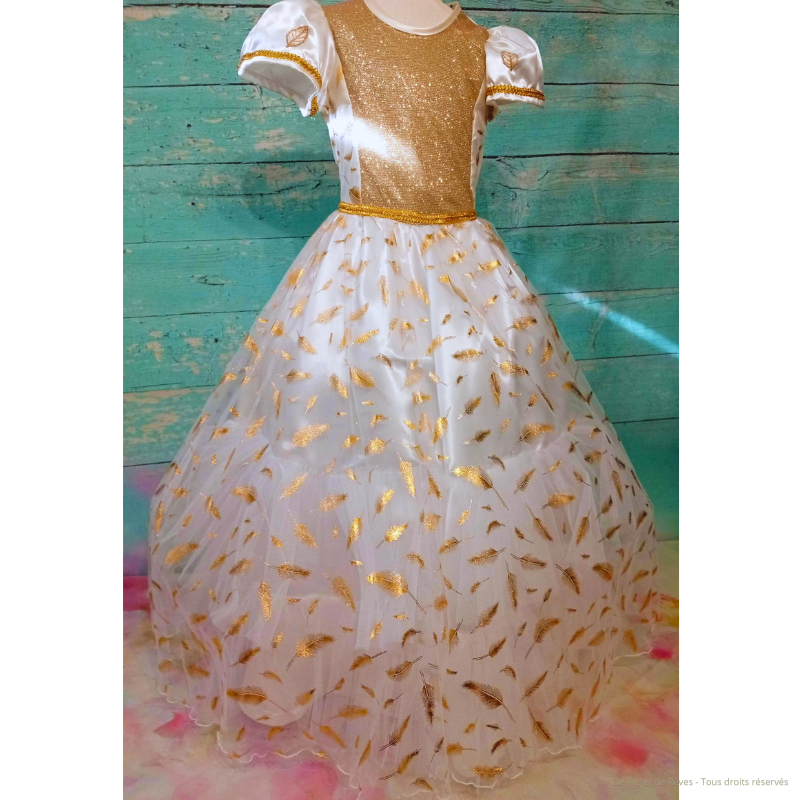 Découvrez cette magnifique robe de princesse Serelys de taille 8 ans dans les tons clairs et dorés. Sa jupe est recouverte de tulle léger aux motifs de plume qui vient sublimer cette robe magique et apporte un volume a effet volant. Vous apprécierez ses détails et ses finitions fait main. Vendue sans jupon.